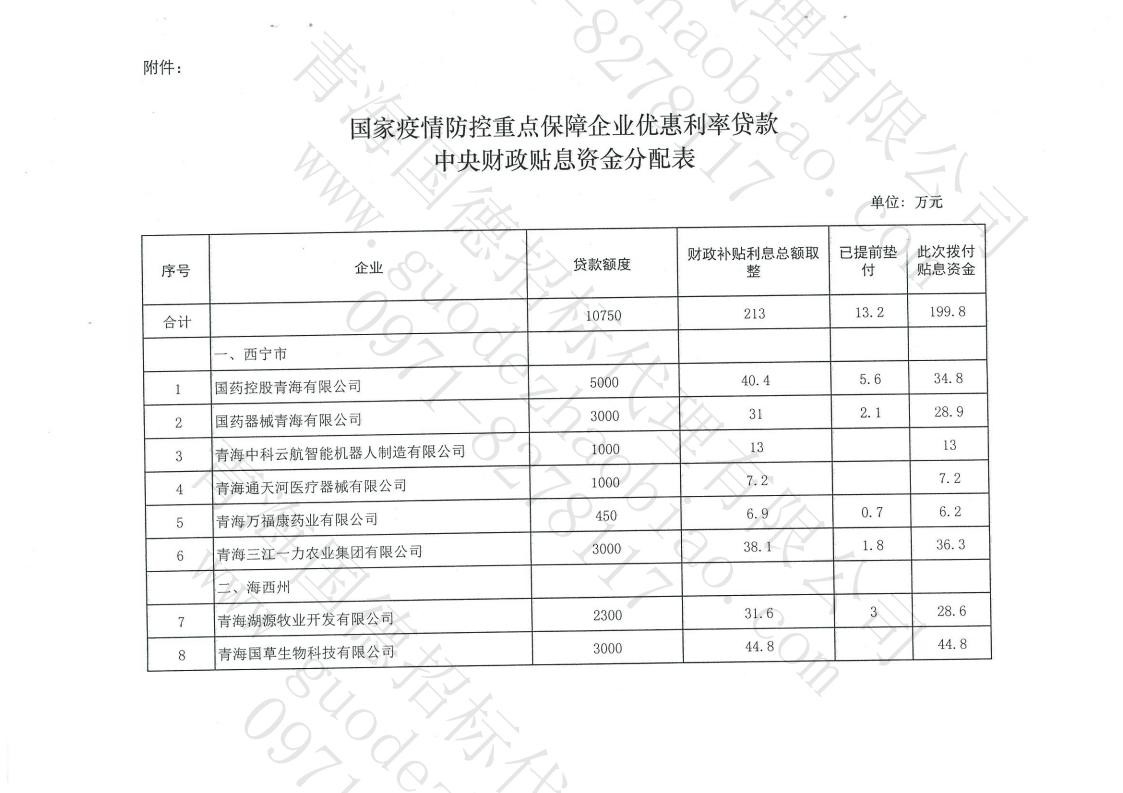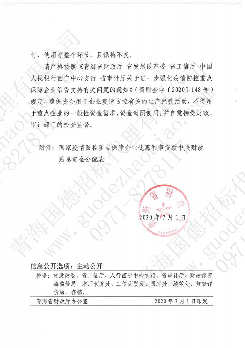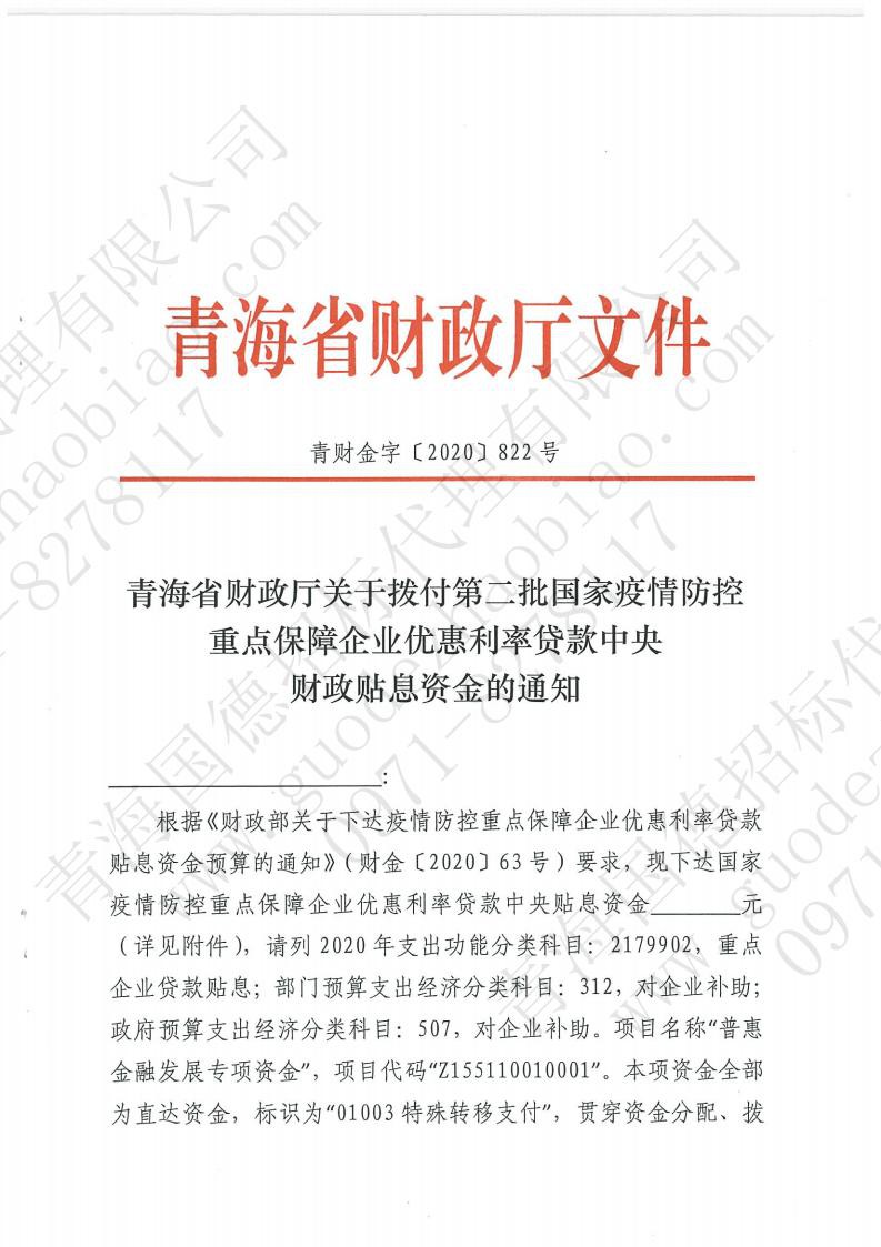 青財金字[2020]822號 青海省財政廳關(guān)于撥付第二批國家疫情防控重點保障企業(yè)優(yōu)惠利率貸款中央財政貼息資金的通知