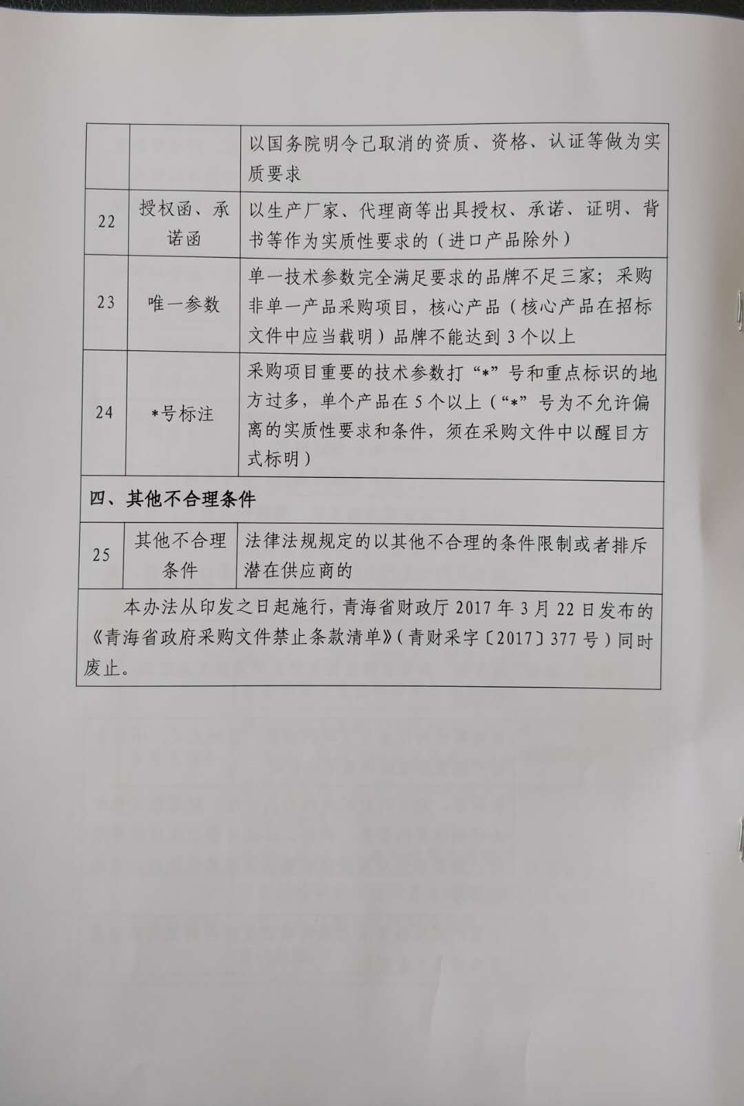 青海省財(cái)政廳關(guān)于印發(fā)《青海省政府采購(gòu)文件禁止條款清單(修訂版)》的通知