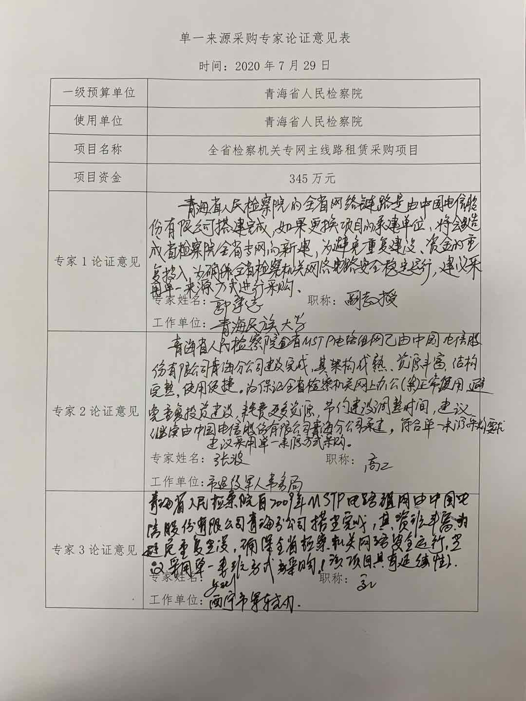 擬采購的貨物或服務(wù)的預算金額(元): 3450000 采用單一來源采購方式的原因及說明: 青海省人民檢察院申請“全省檢察機關(guān)專網(wǎng)主線路租賃項目”擬采用單一來源方式采購,申請理由如下:自2009年起,全省MSTP電路組網(wǎng)由中國電信股份有限公司青海分公司搭建完成,隨著檢察業(yè)務(wù)技術(shù)發(fā)展,2018年起采用點對點IPRAN組網(wǎng)方式,省級院、市州院、鐵檢院、西平檢察院檢察專網(wǎng)及工作網(wǎng)電路帶寬提升至200M電路;各區(qū)縣院、派駐檢察室、軍事檢察院電路帶寬提升至100M;本項目建設(shè)主要是在現(xiàn)有電路基礎(chǔ)上進行改造和擴容,選擇青海電信進行項目建設(shè),有利于保證項目建設(shè)的前后銜接性和售后服務(wù)的保障,有利于控制項目建設(shè)節(jié)點和進度,有效降低項目成本;因涉及主線路電路架構(gòu)的完整性和持續(xù)性,對于該架構(gòu)的建設(shè)方中國電信股份有限公司青海分公司擁有不可替代的架構(gòu)熟悉程度,是其他同行業(yè)無法短時間內(nèi)實現(xiàn)的,為了不影響全省檢察系統(tǒng)的正常運作,建議繼續(xù)由中國電信股份有限公司青海分公司承建此項目。 二、擬定供應(yīng)商信息 名稱: 中國電信股份有限公司青海分公司 地址: 青海省西寧市金匯路29號 三、公示期限 2020年07月29日 至 2020年08月05日 四、其他補充事宜 / 五、聯(lián)系方式 1.采購人信息 名 稱: 青海省人民檢察院 聯(lián)系人:鄧玢 聯(lián)系電話: 6304376 傳 真: / 地 址: 青海省西寧市五四西路17號 名 稱: 青海省財政廳政府采購監(jiān)督管理處 聯(lián)系人 : 李強 監(jiān)管部門電話:0971-6367644 傳 真: 0971-6159677 地 址: 青海省西寧市黃河路30號 附件信息: