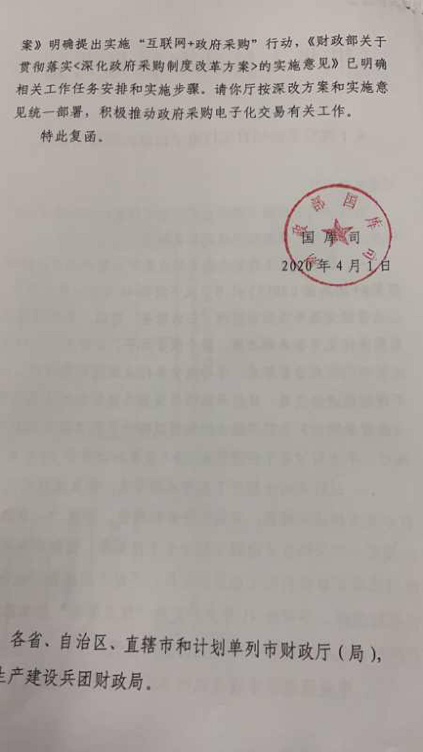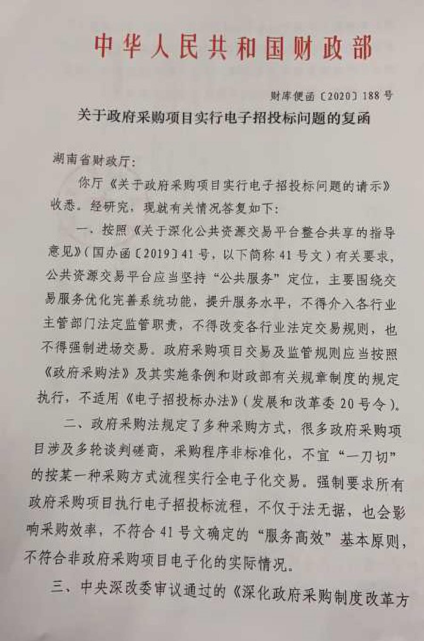 財政部關(guān)于湖南省財政廳《關(guān)于政府采購項目實行電子招標問題的請示》的復函