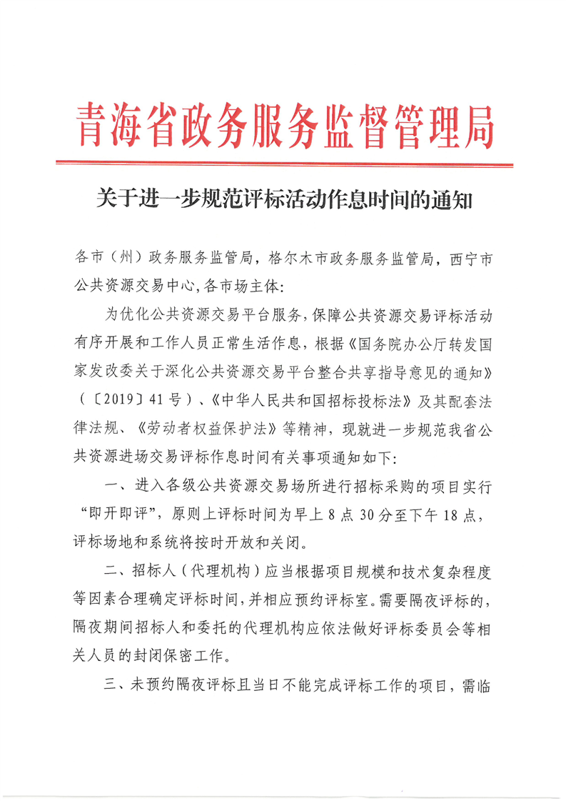 青海省政務(wù)服務(wù)監(jiān)督管理局關(guān)于進(jìn)一步規(guī)范評標(biāo)活動(dòng)作息時(shí)間的通知