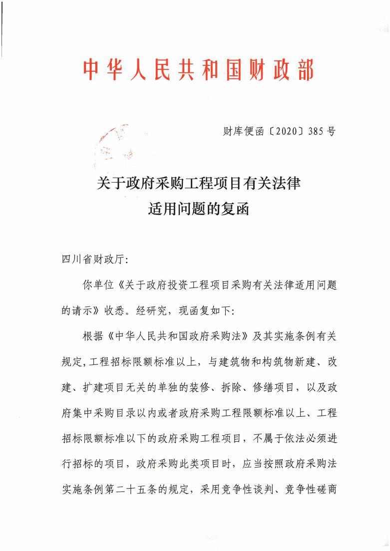 四川省財政廳: 你單位《關(guān)于政府投資工程項目采購有關(guān)法律適用問題的請示》收悉。經(jīng)研究,現(xiàn)函復(fù)如下: 根據(jù)《中華人民共和國政府采購法》及其實施條例有關(guān)規(guī)定,工程招標(biāo)限額標(biāo)準(zhǔn)以上,與建筑物和構(gòu)筑物新建、改建、擴(kuò)建項目無關(guān)的單獨的裝修、拆除、修繕項目,以及政府集中采購目錄以內(nèi)或者政府采購工程限額標(biāo)準(zhǔn)以上、工程招標(biāo)限額標(biāo)準(zhǔn)以下的政府采購工程項目,不屬于依法必須進(jìn)行招標(biāo)的項目,政府采購此類項目時,應(yīng)當(dāng)按照政府采購法實施條例第二十五條的規(guī)定,采用竟?fàn)幮哉勁?、竟?fàn)幮源枭袒蛘邌我粊碓捶绞竭M(jìn)行采購。 財政部國庫司 2020年6月16日